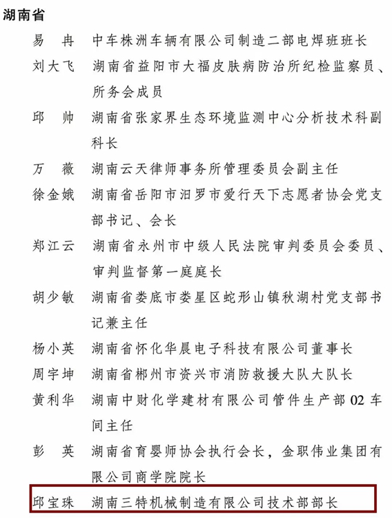 為表彰先進、樹立榜樣,進一步引領和激勵廣大婦女堅定不移聽黨話、跟黨奮進新征程,豪情滿懷、意氣風發投入推進中國式現代化的偉大實踐,日前,全國婦聯決定授予10人全國三八紅旗手標兵稱號,298人全國三八紅旗手稱號,授予199個單位全國三八紅旗集體稱號,其中,來自桃源的湖南三特機械制造有限公司技術部部長 邱寶珠 獲得全國三八紅旗手榮譽。
